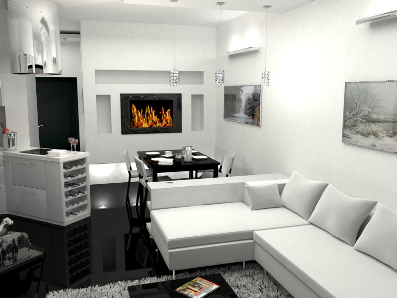 Угловым диваном или креслами отделить один кусочек гостиной для приёма гостей. А в другой части, небольшая студия, или мини бар. Если нужно совместить гостиную с кухней, не забудьте про вытяжку над плитой.