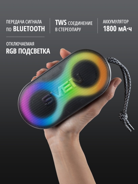Особенности устройства: мощность 10 Вт; разноцветная динамическая RGB-подсветка; компактный корпус; беспроводная передача сигнала по Bluetooth; удобный шнурок для переноски; беспроводное сопряжение двух колонок с одним источником; защита от воды IPx5; качественный динамик Ø 50 мм, пассивный излучатель для эффектного баса; вход Aux для проводного подключения источника звука.