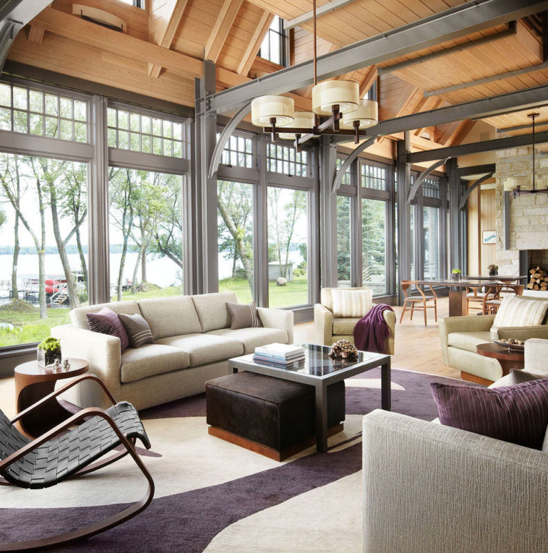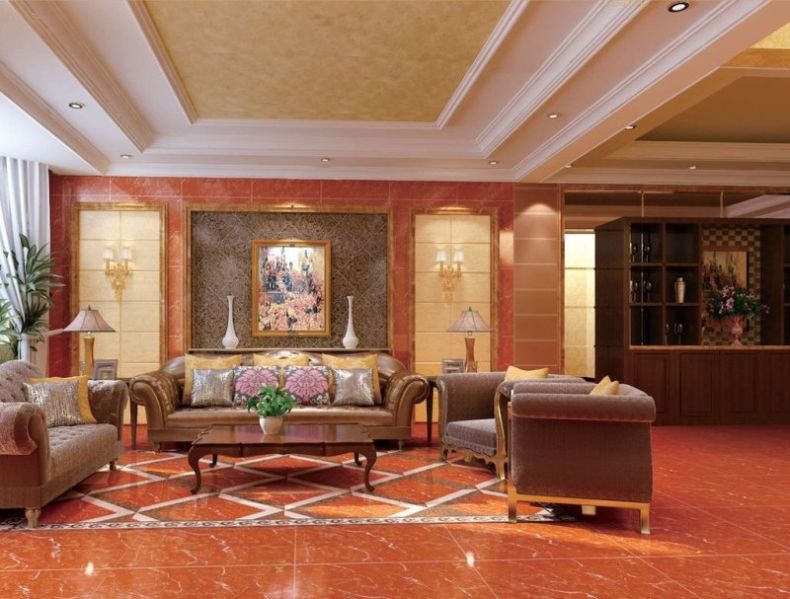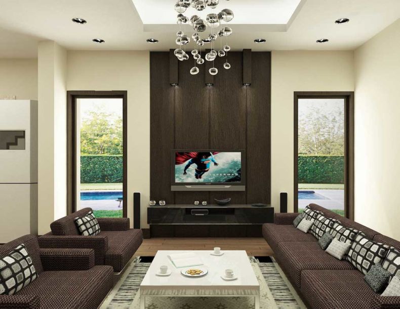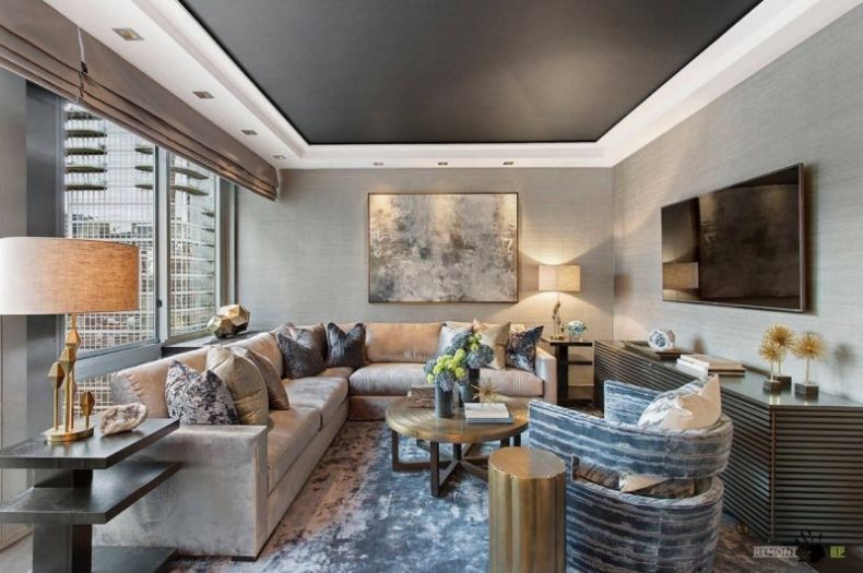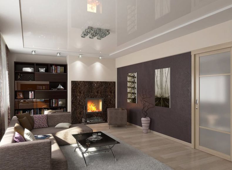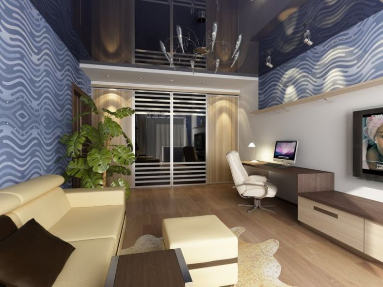 Во времена СССР весь дизайн гостиной комнаты ограничивался установкой нескольких шкафов, навесом ковров, не придавалось никакого значения потолку. Чаще все данная часть помещения просто белилась, вешалась люстра и как бы на этом оформление заканчивалось. Теперь потолок воспринимается иначе, как часть интерьера.