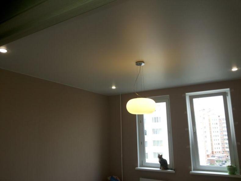 Натяжные потолки в гостиной легкие в обслуживании, особого ухода не требуют. Эксплуатационный срок такого потолка порядка десяти лет. Если соседи вдруг затопят, то потолок выдержит напор воды, благодаря чему в комнате не произойдет порча вещей.