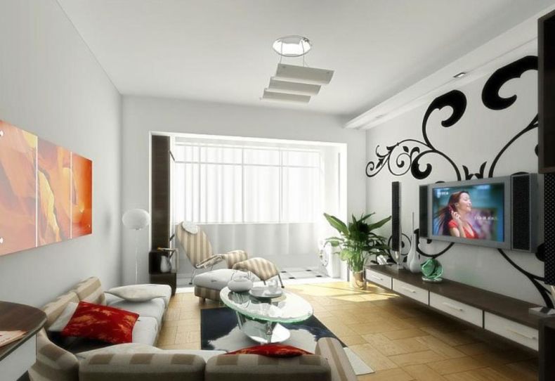 В интернете немало фото потолка в гостиной, красиво декорированные. Используется для декора лепнина, роспись, балки, наклейки. Вариантов декора масса, и выбор лишь за вами.