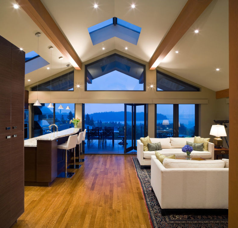 Такой вариант потолка заметно видоизменяет гостиную комнату, придавая пластику и объем. Такой потолок подчеркивает все части помещения, визуально делит на зоны.
