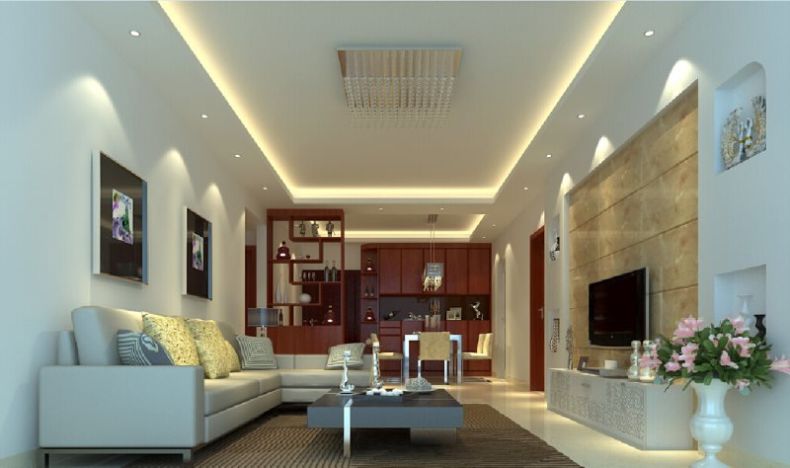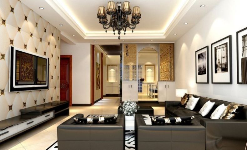 - Потолок из гипсокартона в гостиной занимает лидирующие позиции. В процессе декорирования это неотъемлемый элемент. Материал не сильно дорогой, в монтаже прост, позволяет создавать любые формы, поверхность делает ровной.