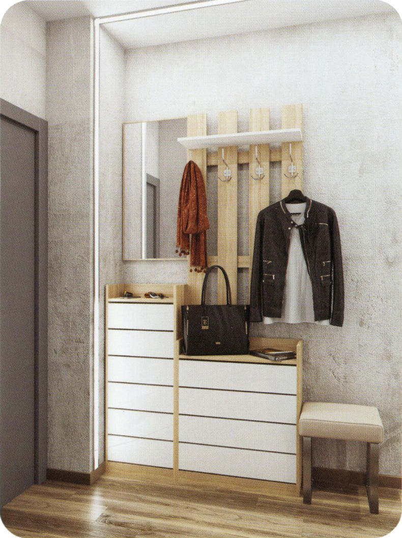 Для этого помещения можно использовать небольшой диван, скамейку, если позволит площадь. Прихожая не обходится без удобных шкафчиков, полок для обуви.