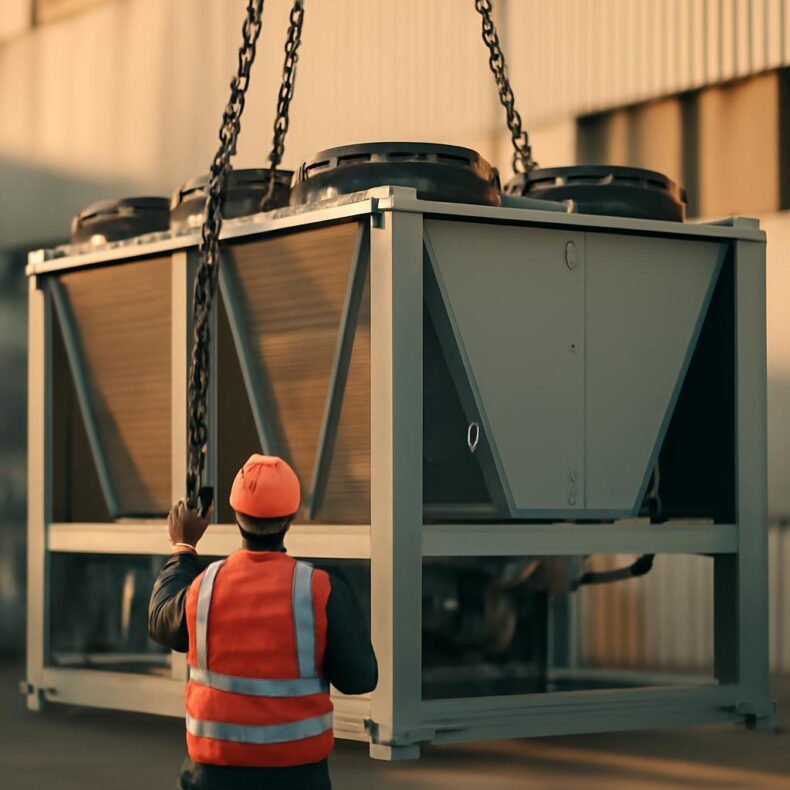 Воздушные чиллеры с конденсаторами, охлаждаемыми воздухом, не требуют внешних источников воды, что упрощает установку в удаленных районах. Они используют вентиляторы для обдува ребристых труб, где происходит конденсация хладагента. Такие модели идеальны для средних производств в сухом климате, например, в текстильной или фармацевтической отраслях Центрального федерального округа. Преимущества включают низкие эксплуатационные затраты на воду (нулевой расход) и мобильность, с возможностью размещения на крыше или в открытом пространстве. Недостатки — снижение эффективности при температурах воздуха выше 35°C (потеря до 20% мощности) и повышенный шум от вентиляторов до 75 д Б. В 2025 году в России воздушные чиллеры составляют около 40% рынка, благодаря простоте по стандартам СП 89.13330.2016 для вентиляции.