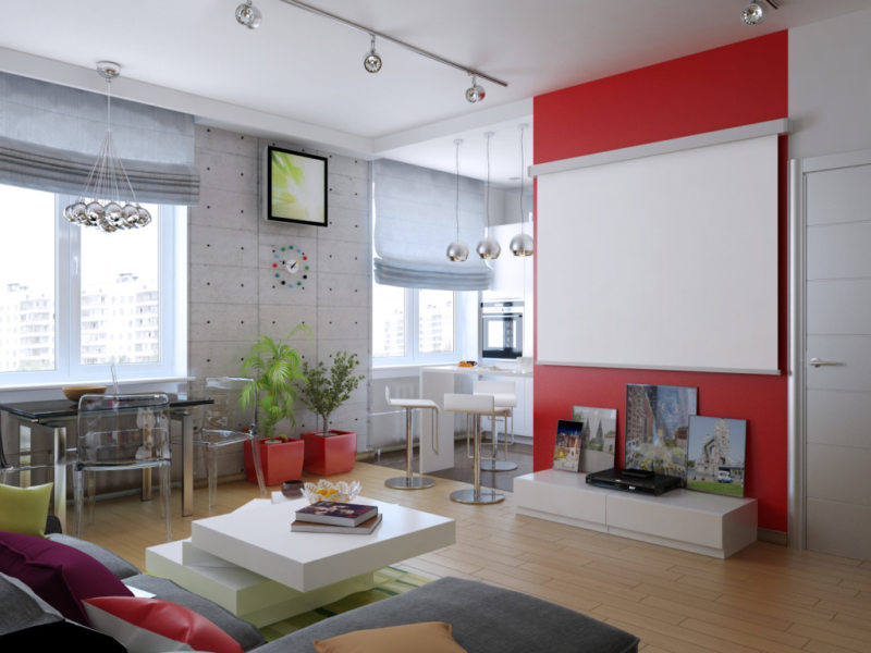 Дизайнеры рекомендуют отказаться от большого скопления мебели и других лишних предметов: проходная гостиная должна быть удобной и лаконичной. Таких хрупких вещей, как вазы, навесные полки или украшения из стекла, должно быть в меру.