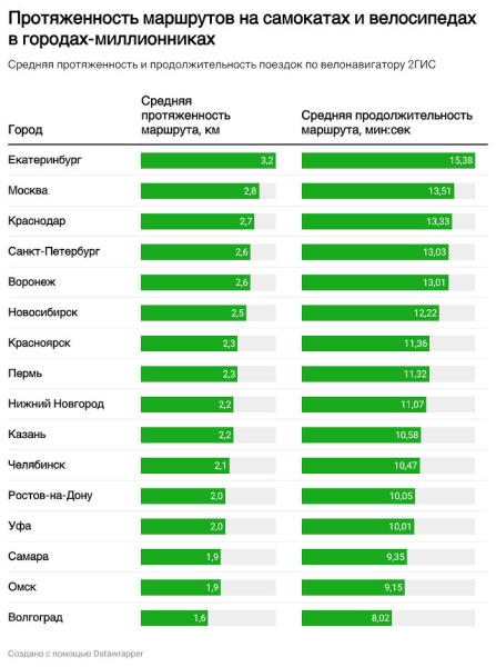 Лидером рейтинга по протяженности и продолжительности поездок на велосипедах и самокатах стал Екатеринбург — 3,15 км и 15 минут 38 секунд. За ним следуют Москва (2,77 км. 13 минут 51 секунда), Краснодар (2,71 км, 13 минут 33 секунды) и Санкт-Петербург (2,64 км). Самые короткие поездки совершают в Волгограде — в среднем 1,58 км за 8 минут. Интересно, что средняя скорость движения в городах примерно одинаковая — около 12 километров в час.
