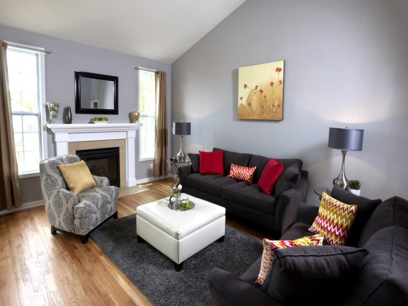 Интерьер гостиной в сером цвете позволяет некоторые вкрапления красного. Но не стоит забывать красный слишком яркий цвет, поэтому для сочетания его нужно немного.