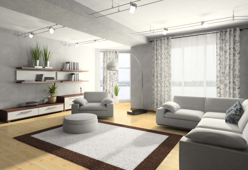 В большинстве случаев серый тон используют как базовый. В данном цвете может быть отделка стен, потолочная поверхность, напольное покрытие или же подбирают мебель, ковер и гардины.