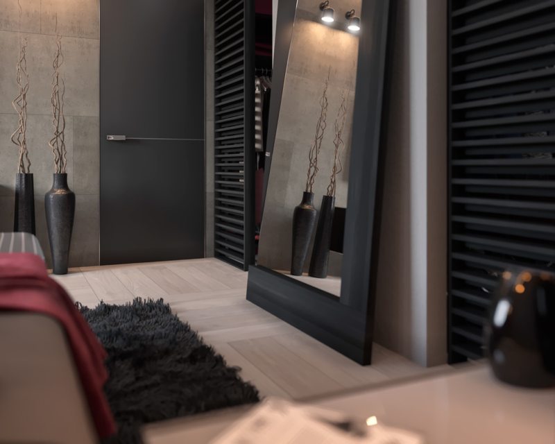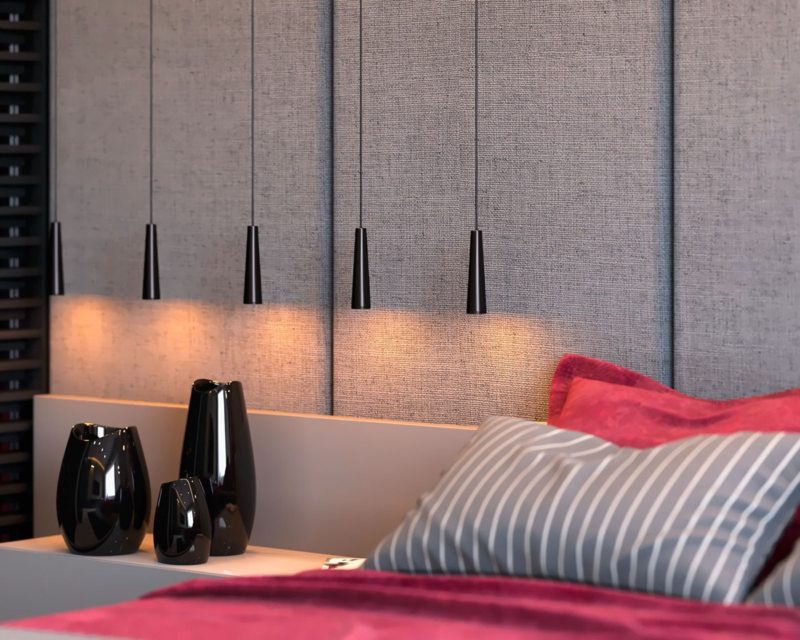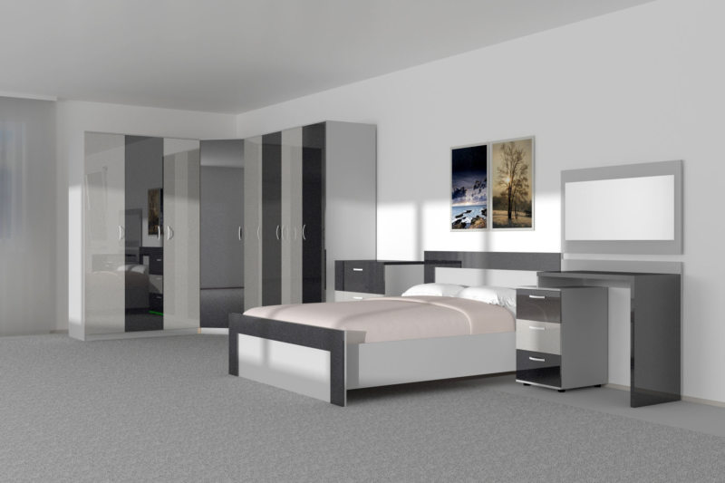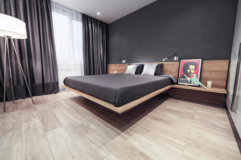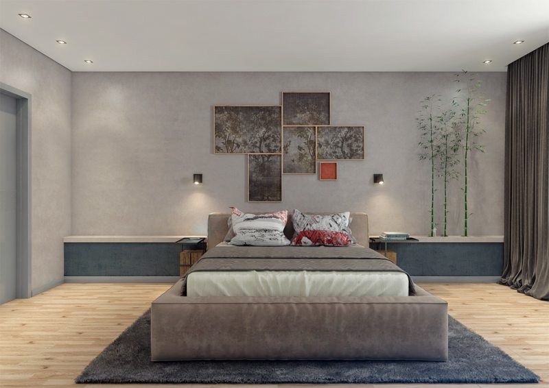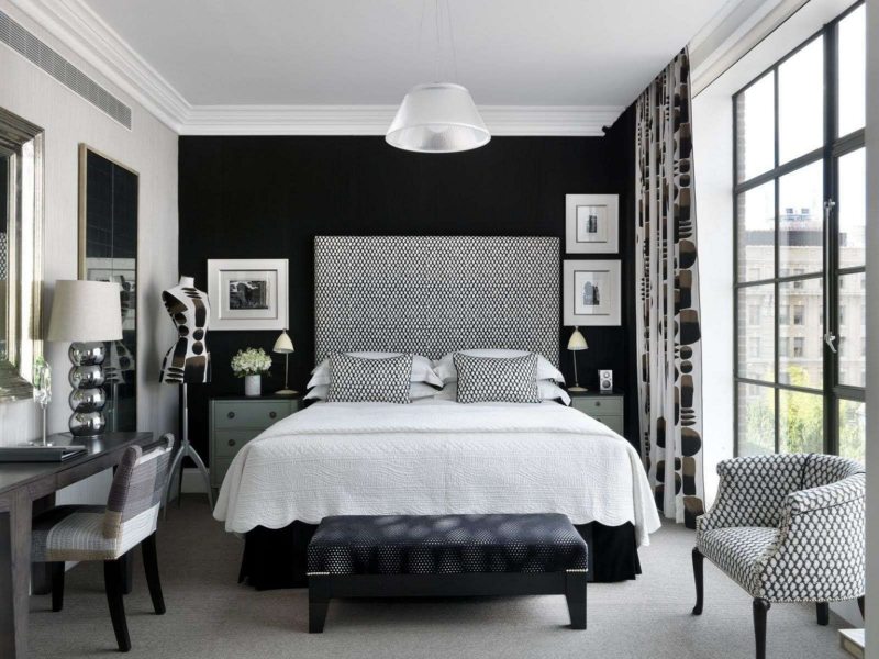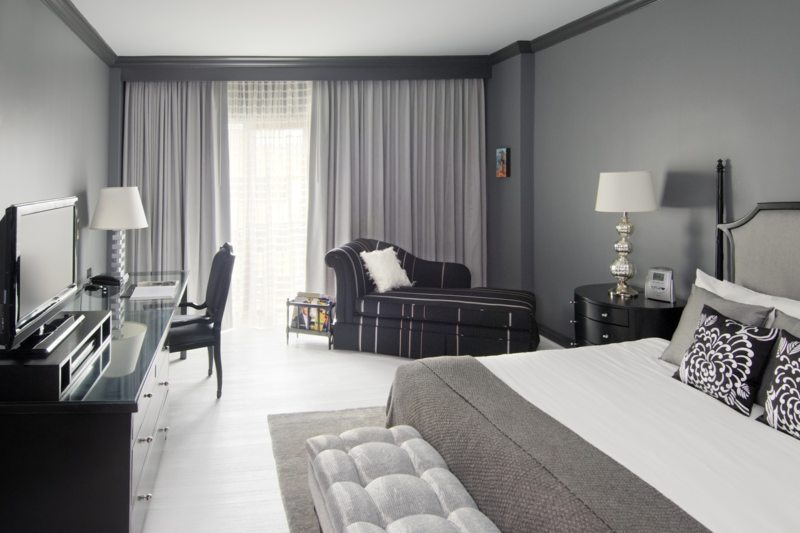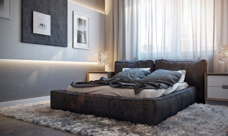 Серые стены в спальне, особенно в сочетании с черным – это выигрышная комбинация цветов для настоящих мужчин или любителей стиля хай-тек. Такой дизайн очень гармоничен, не режет глаз и подавляет агрессию.