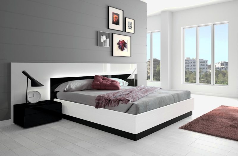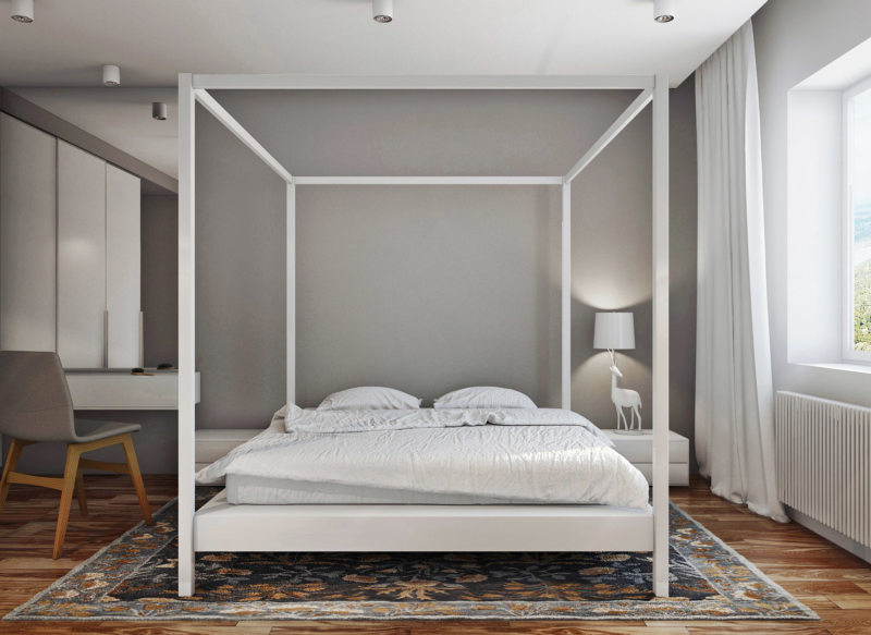 Спальня такого плана отличается чистотой линий и простотой обстановки. Главное не перебарщивать с количеством добавочных цветов, в идеале их должно быть не больше двух.