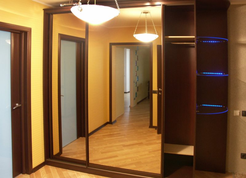 - подсветка внутри шкафов купе позволяет осветить всё пространство и сделать доступными даже самые труднодоступные участки;