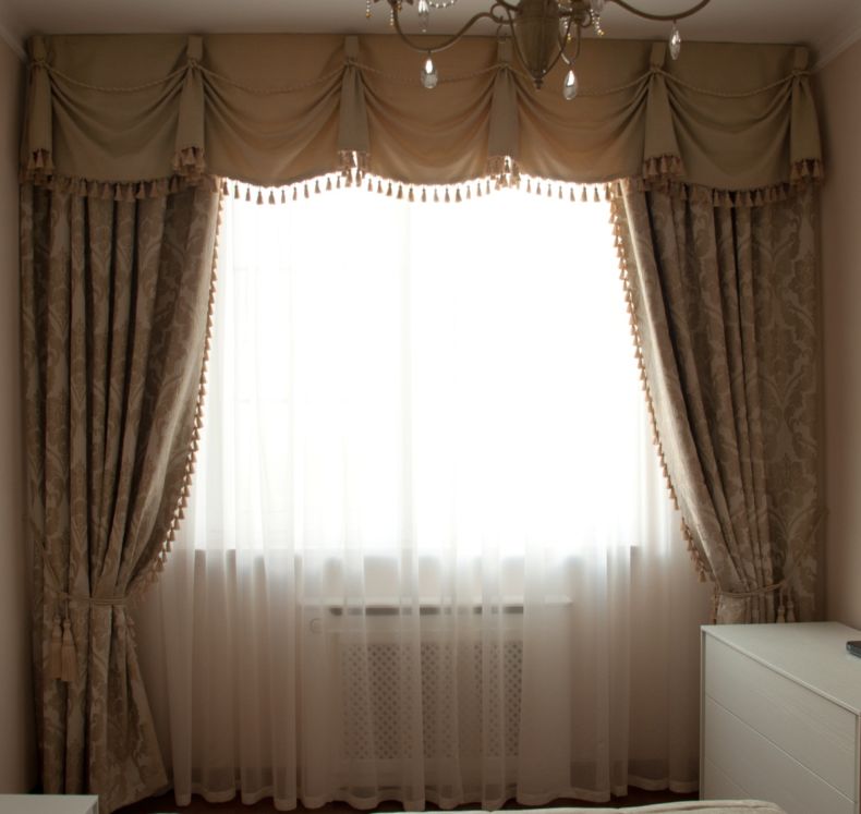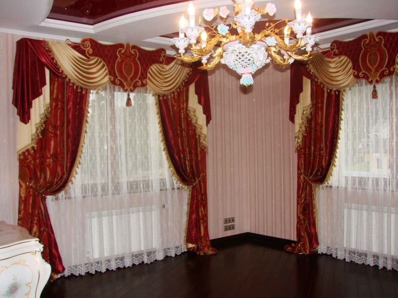 Чаще всего такие шторы шелковые или бархатистые, из ситца, жаккарда или парчи. В некоторых случаях для акцентирования деталей можно использовать шелк с тафтой, одновременно с льном и хлопком. Главная особенность в том, что все элементы должны между собой очень гармонично сочетаться. Что касается текстиля, то материалы должны быть хоть «где-то» похожими между собой.