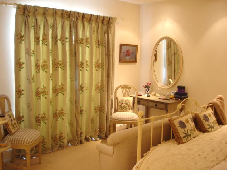 Комплект штор для спальни здесь способен создать некий шарм в помещении. Вуаль их хлопка в кремовом, белом цвете, с тонкими нотками сирени или аметиста/темного-зеленого, придадут помещению теплоты, наполняя его лавандовым ароматом. Так называемый деревенский стиль в современном способе оформления обрел новые нотки. Ткани обязательно используют натуральные, они могут быть украшены цветками, прочими узорами, например, клеточкой, полосочкой, различного размера горошинками.
