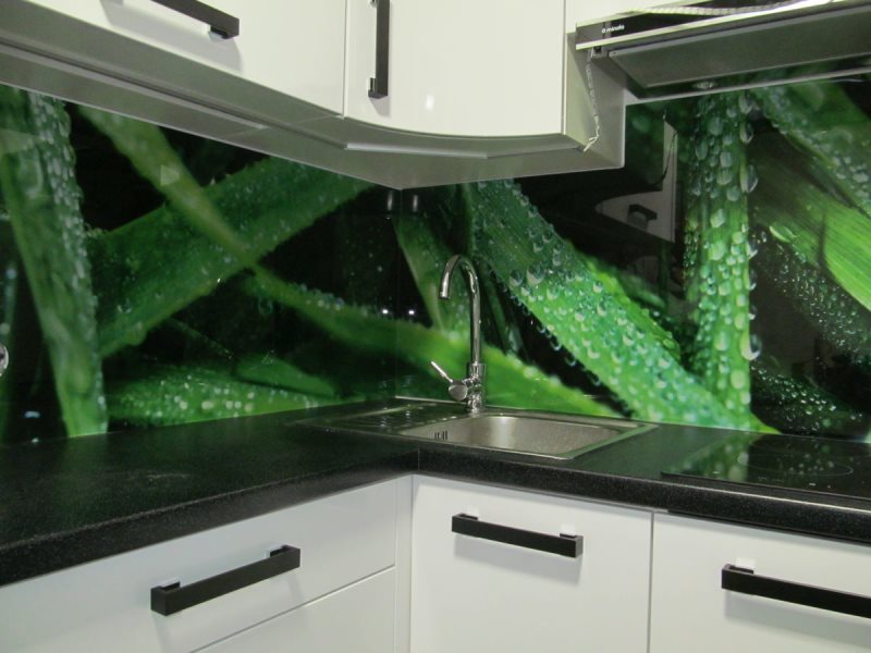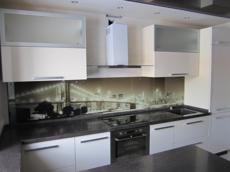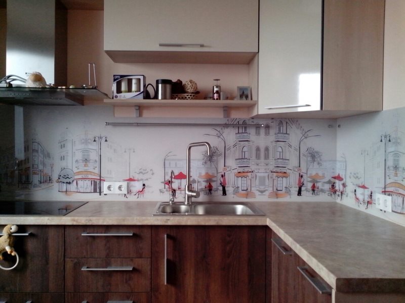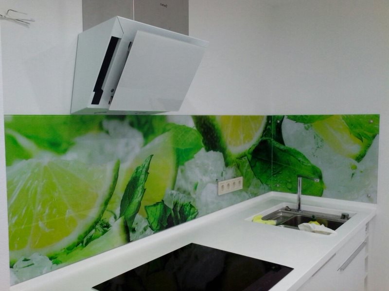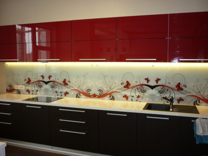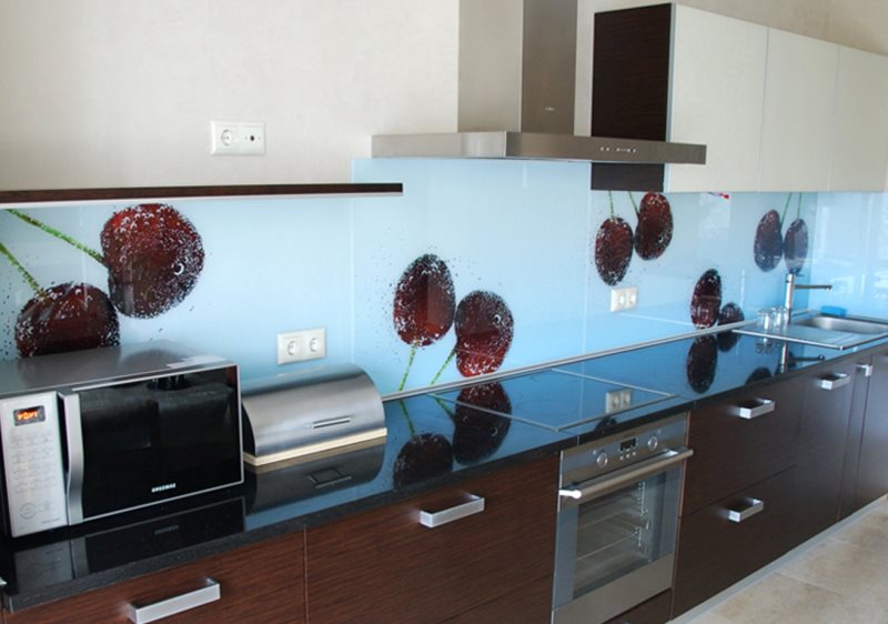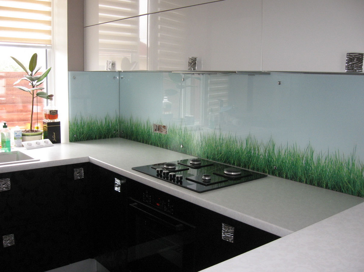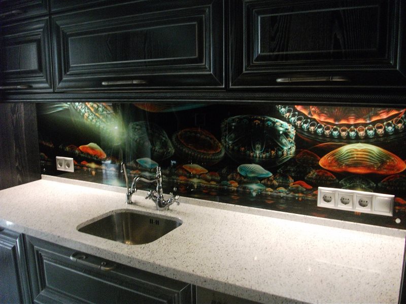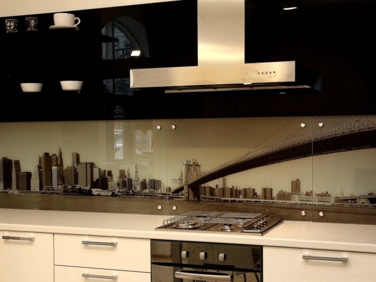 Изображение может быть нанесено непосредственно на стекло или на пленку, которая крепится к стеклу с изнаночной стороны. Такой метод, как стереопечать, дает иллюзию объемного рисунка. Рисунок на пленке значительно удешевляет скинали, но от этого фартук в кухне будет смотреться не менее эффектно. Фон может быть прозрачным или матовым.