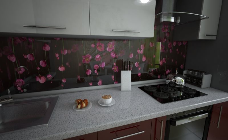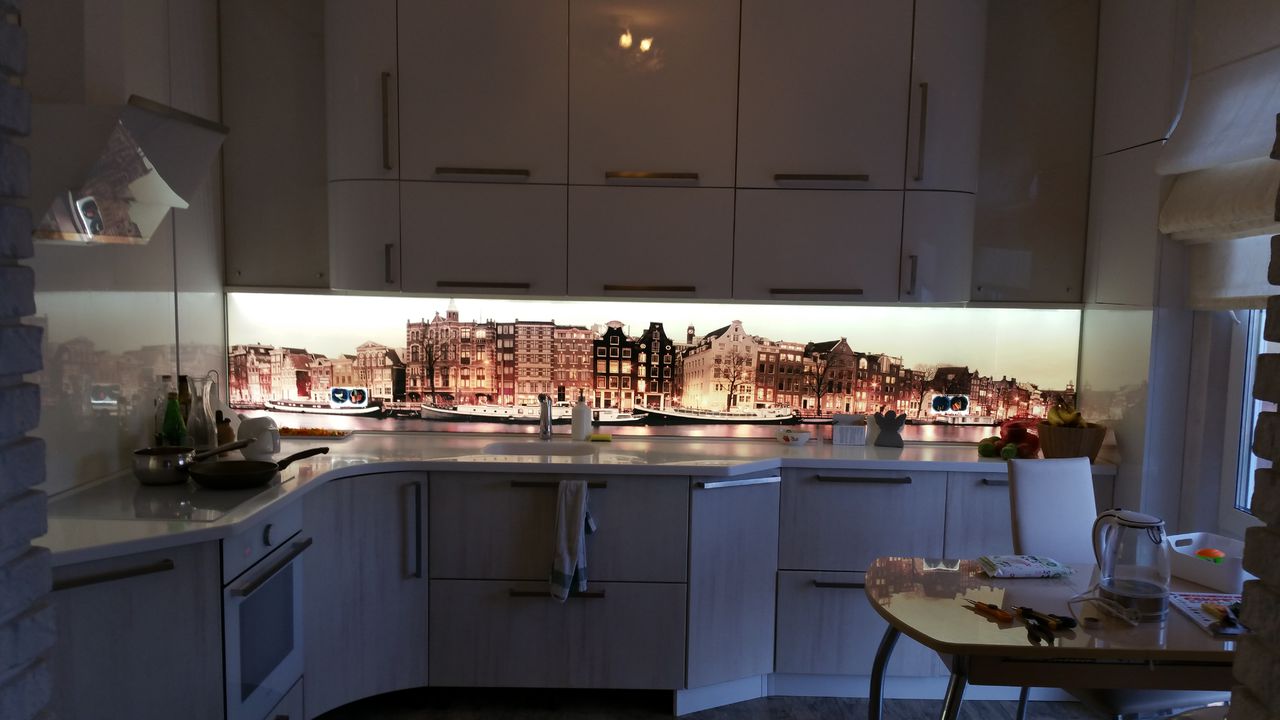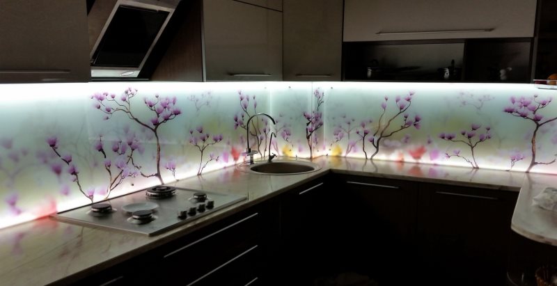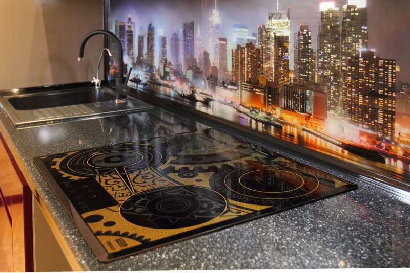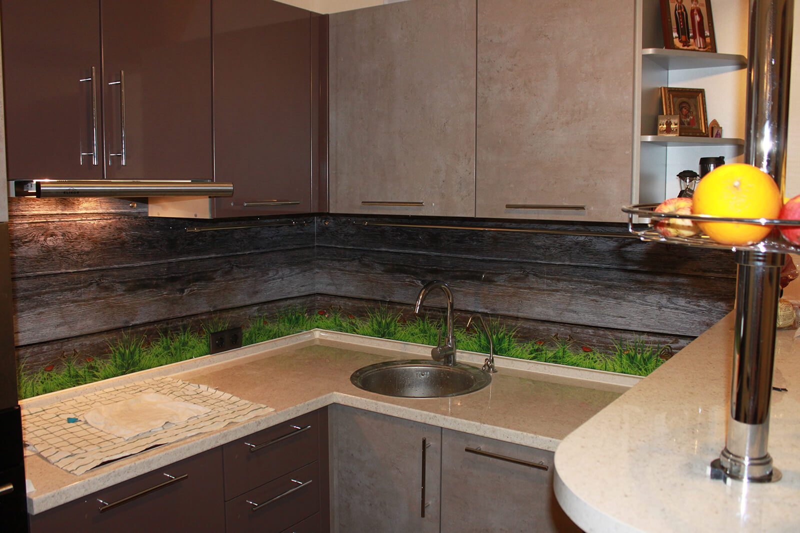 Скинали из стекла для кухни представляют собой прозрачную панель поверх рисунка. Поскольку панель имеет определенную толщину, создается эффект 3D рисунка. Такой фартук способен зрительно менять конфигурацию помещения.