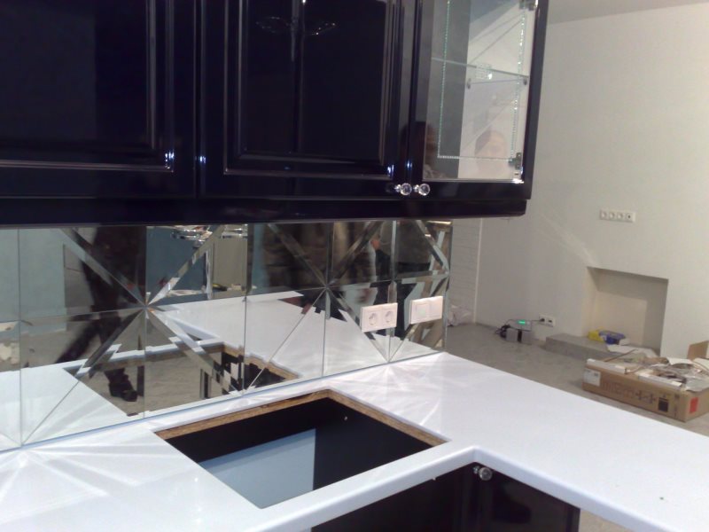 Зеркальное покрытие, благодаря отражающей поверхности, визуально расширит маленькую кухню.