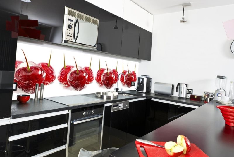 Чтобы правильно подобрать рисунок для скинали, нужно ориентироваться на общую цветовую гамму кухонной отделки. Так, современные стили приветствуют крупные изображения: яркий фрукт, чашка кофе, бутон. Эффектно смотрятся они на белом фоне. Фото в черно-белом цвете с изображением газетных страниц, городов, авомобилей – это хай-тек или лофт – стили бльших пространств.