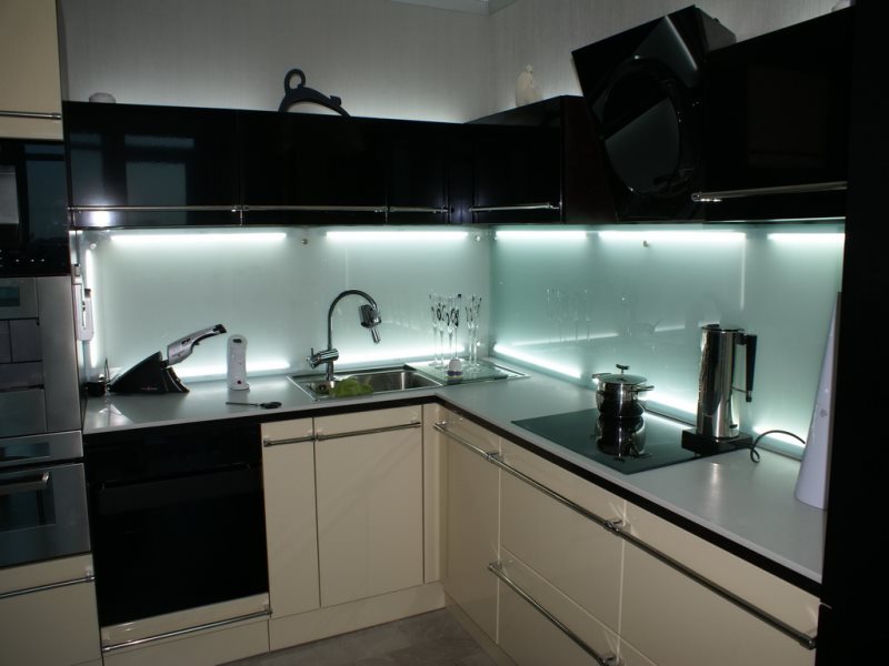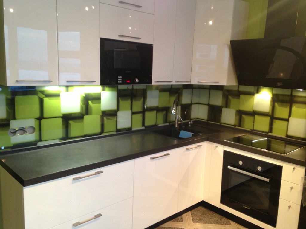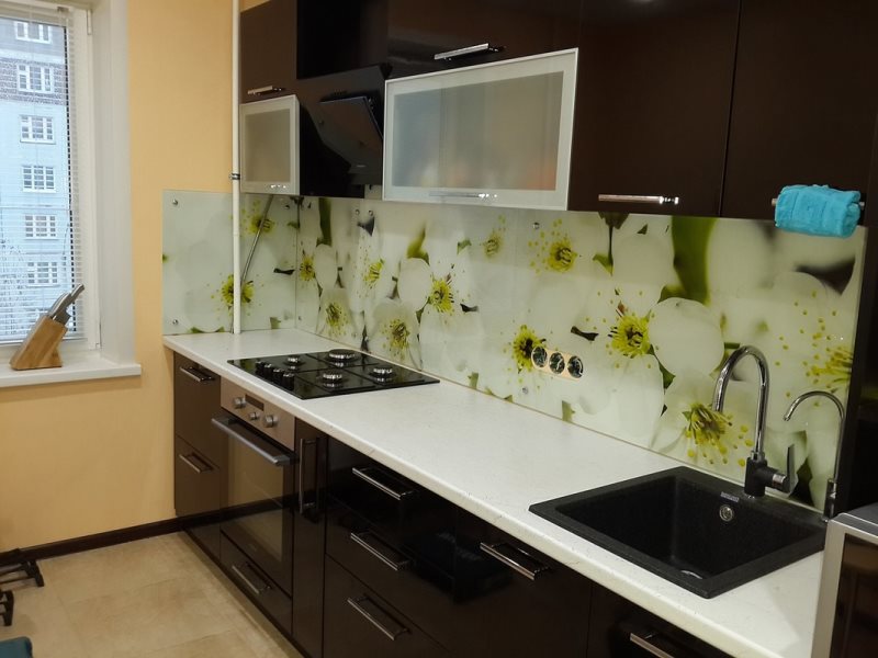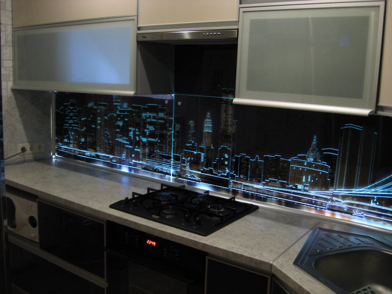 Нужно понимать, что обычное стекло для скинали не подходит из-за своей хрупкости. Оно должно быть закаленным, чтобы случайные удары кухонной утварью не разбили его.
