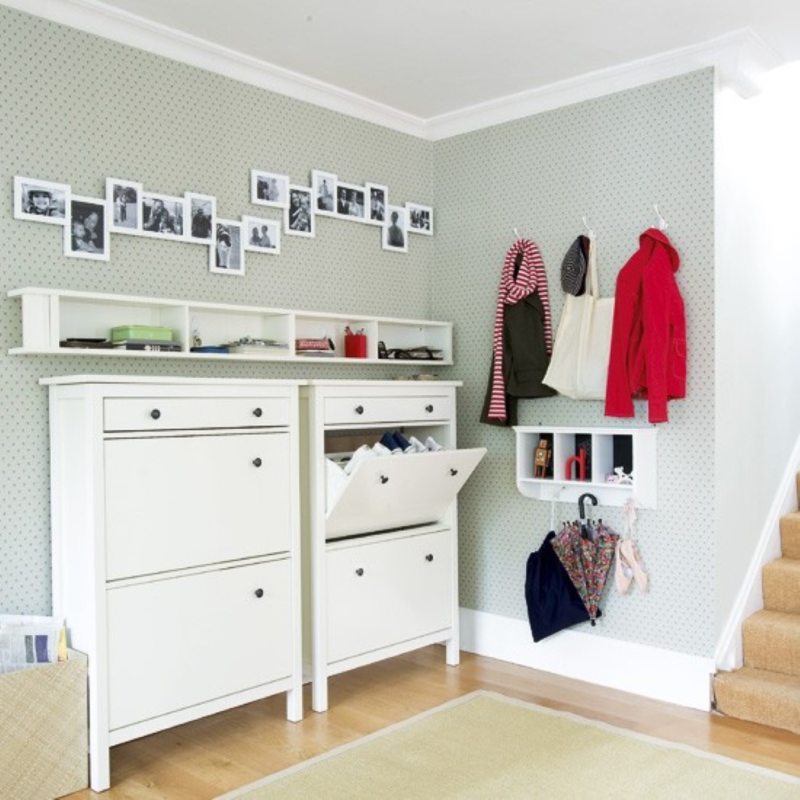 Нечасто в целях экономии используют антресоли. Но их не рекомендуется использовать. Если же вы ярый поклонник этого предмета, тогда делайте полки в меру узкими по всей ширине прихожей.