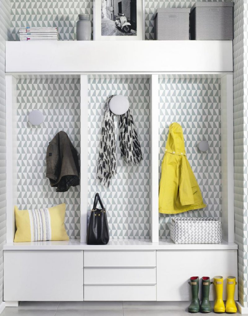 Современные прихожие 2017 максимально используют даже углы стен. Шкафы в таком месте или детские игрушки отлично поместятся, не мешая при этом, не создавая загроможденность.