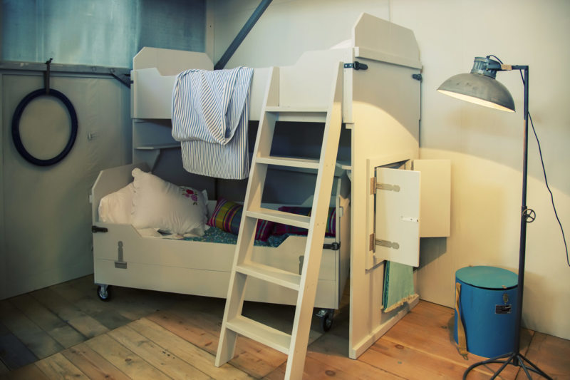 Если это небольшая спальня для двух детей, то стоит задуматься о размещении двухъярусной кровати. На верхнем ярусе желательно разместить старшего ребенка.