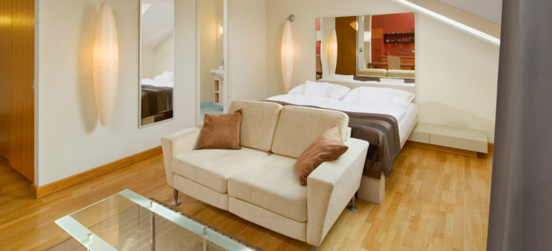 По этой причине зонирование гостиной и спальни чаще осуществляют другими способами. Избежать постоянных манипуляций с мебелью позволяет грамотное разделение пространства.