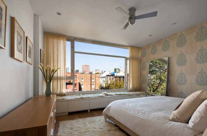 Возможно, что видно на фото спальни с двумя окнами, размещение зоны отдыха и расслабления. Из мебели – это кресло – мешок, или маленький столик, приобретите торшер. Все это прекрасно подойдет для интерьера спальни с двумя окнами.