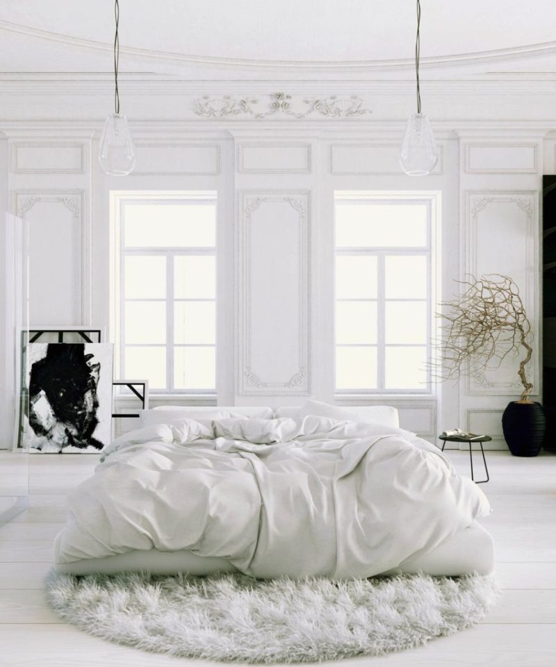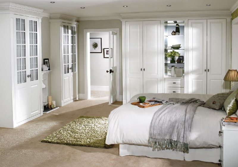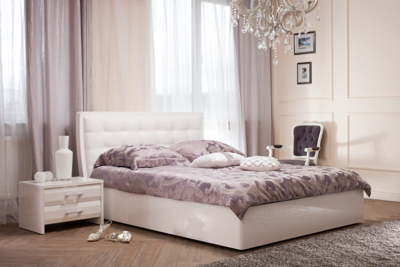 Если спальня выполнена в белоснежно – белом цвете, то с первого взгляда она может показаться достаточно холодной. Добавить теплоты, поможет текстильное оформление в кремовом цвете.