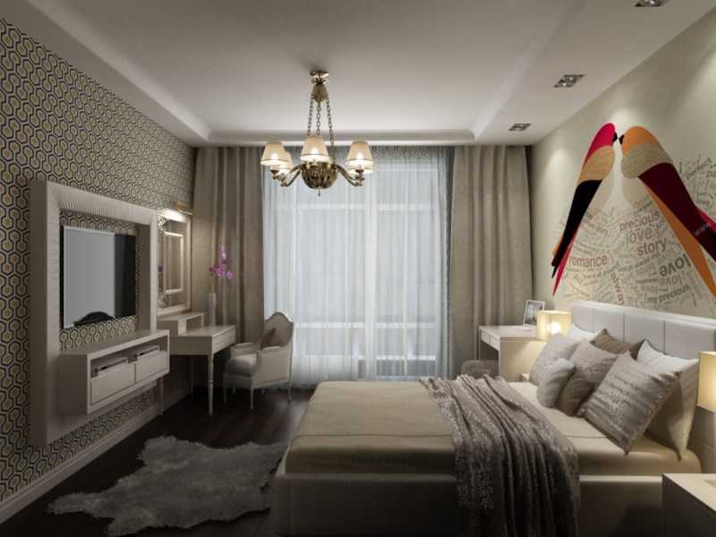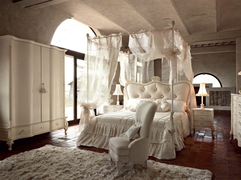 Текстиль с принтом в виде мелких цветов, создает романтическую обстановку. В большинстве случаев за основу берется бежевый и кремовый цвет. Мебель, как правило, выполнена в бело – бежевой гамме. На фото спальни в светлых тонах запечатлены лучшие дизайнерские решения.