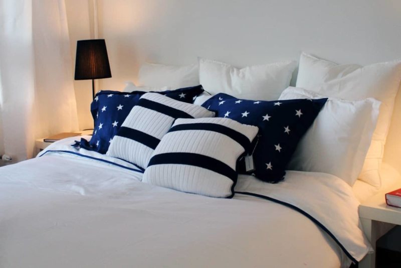 Декоративные подушки на кровати, будут служить главным акцентом. Бежевые шторы добавляют в пространство нежности. Комната выглядит максимально комфортной и функциональной.