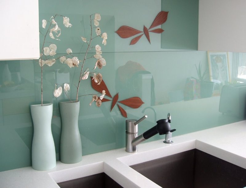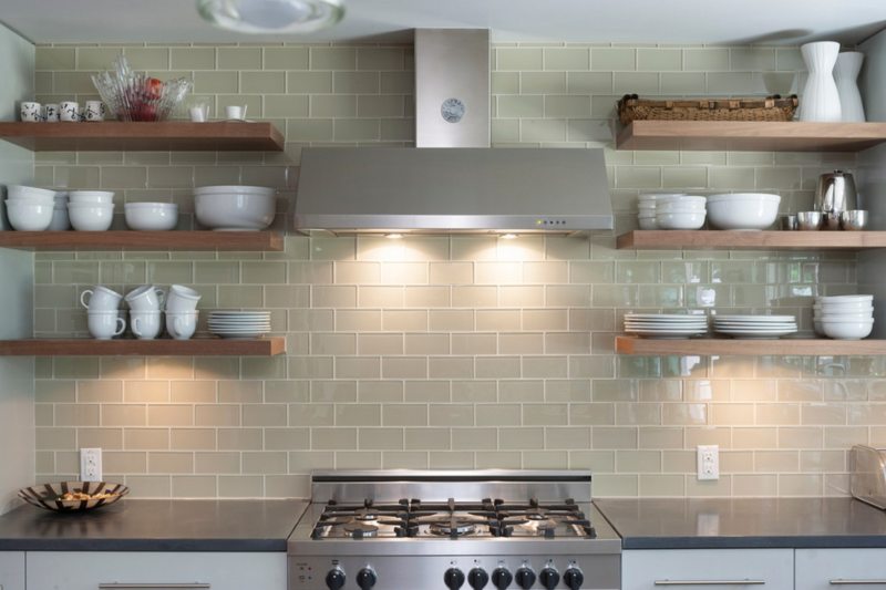 Но отделанный плиткой «фартук» — не самое удачное решение: в область стыка плиток со временем забивается грязь и жир, и отчистить их бывает попросту невозможно. Поэтому для подобных целей используются специальные панели или стекло.