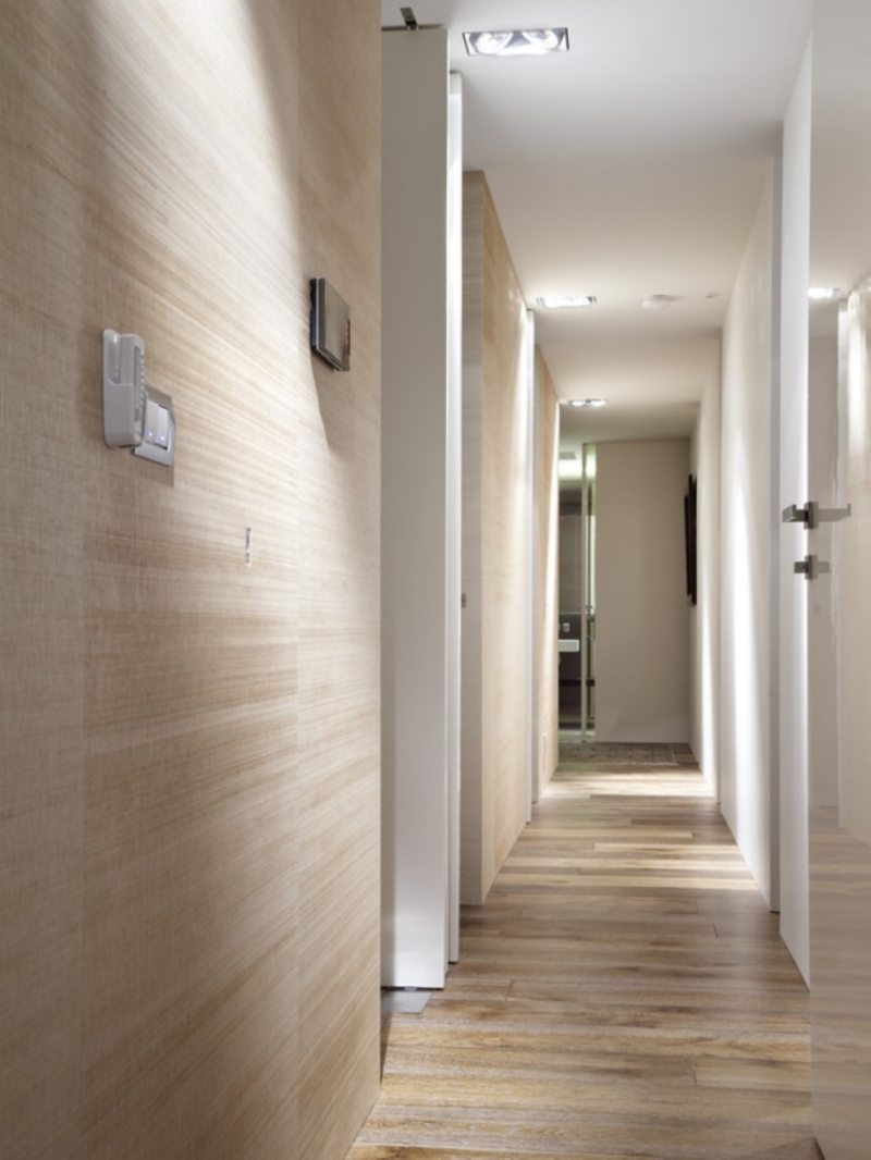 В городских квартирах в основном длинные и узкие коридоры, и потому светильник подбирается так, чтобы визуально помещение казалось шире, а местами даже можно было немного скорректировать геометрию.