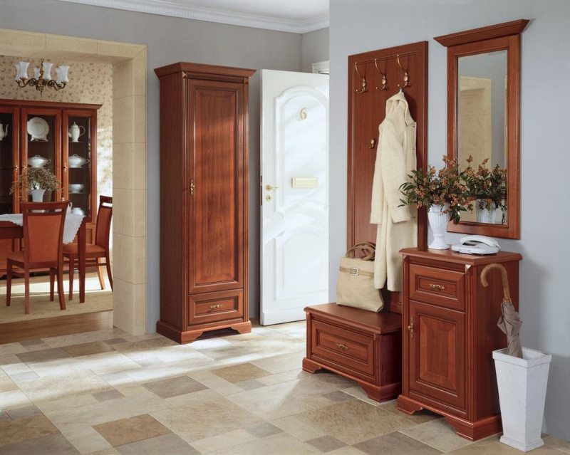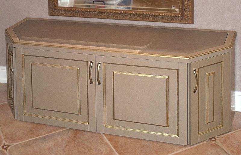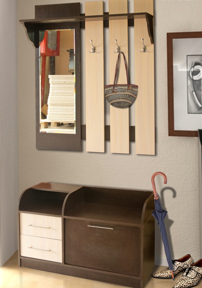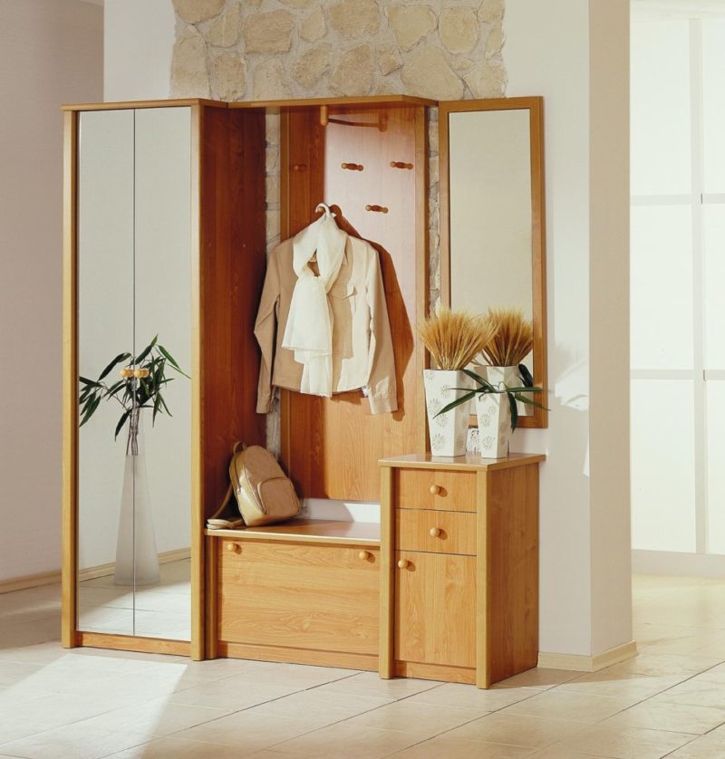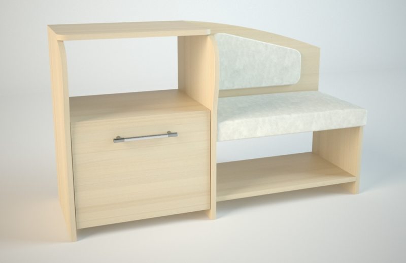 Банкетка с тумбочкой в прихожую может быть исполнена так, что в ней будут находиться вешалки и зеркало. Это не только удобно, но и практично.