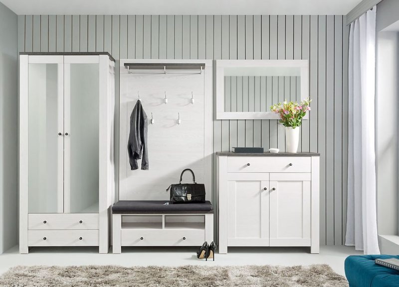 Есть место для верхней одежды, а также удобно перед выходом посмотреть в зеркало. Для зрительного увеличения пространства, вы можете тумбу оснастить небольшой подсветкой, это создаст потрясающий эффект.