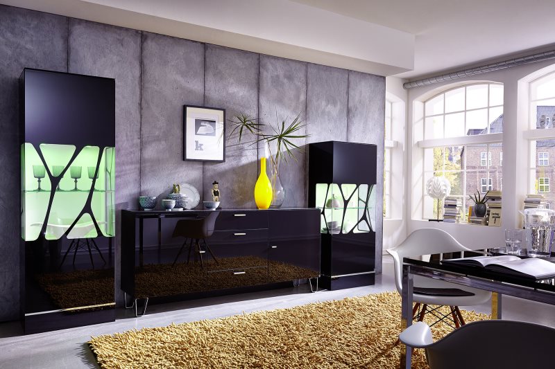 - Стенка не самым выигрышным образом смотрится в гостиной с невысокими потолками.