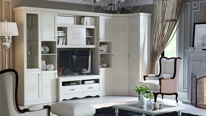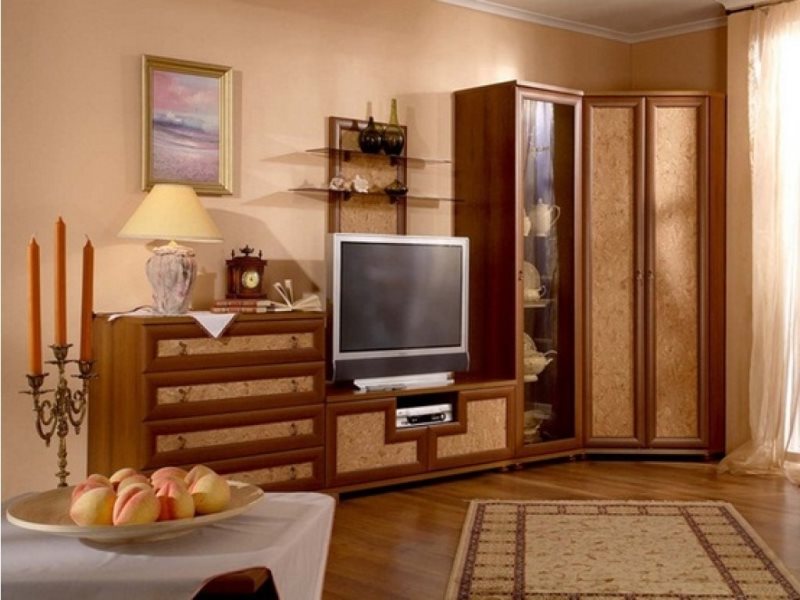 Угловая стенка – самый вместительный элемент интерьера при своих компактных размерах. Для небольшой гостиной варианта лучше и не придумать.