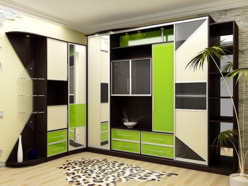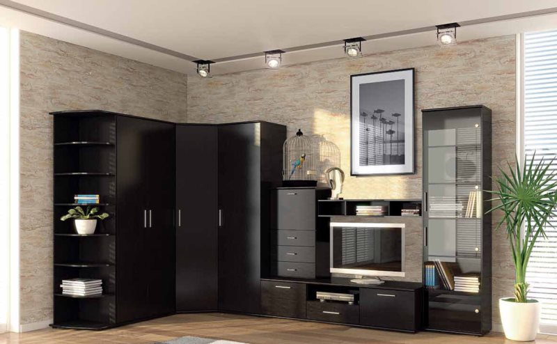 - Стенка благодаря уникальной форме прекрасно задействует именно те части комнаты, что чаще всего используются малоэффективно, а бывает и вовсе не использованы. По данной причине почти весь корпус расположен в углу, и потому в комнате достаточно просторно.