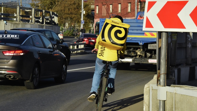 Курьер службы доставки «Яндекс.Еда» едет по обочине дороги на велосипеде. Архивное фото