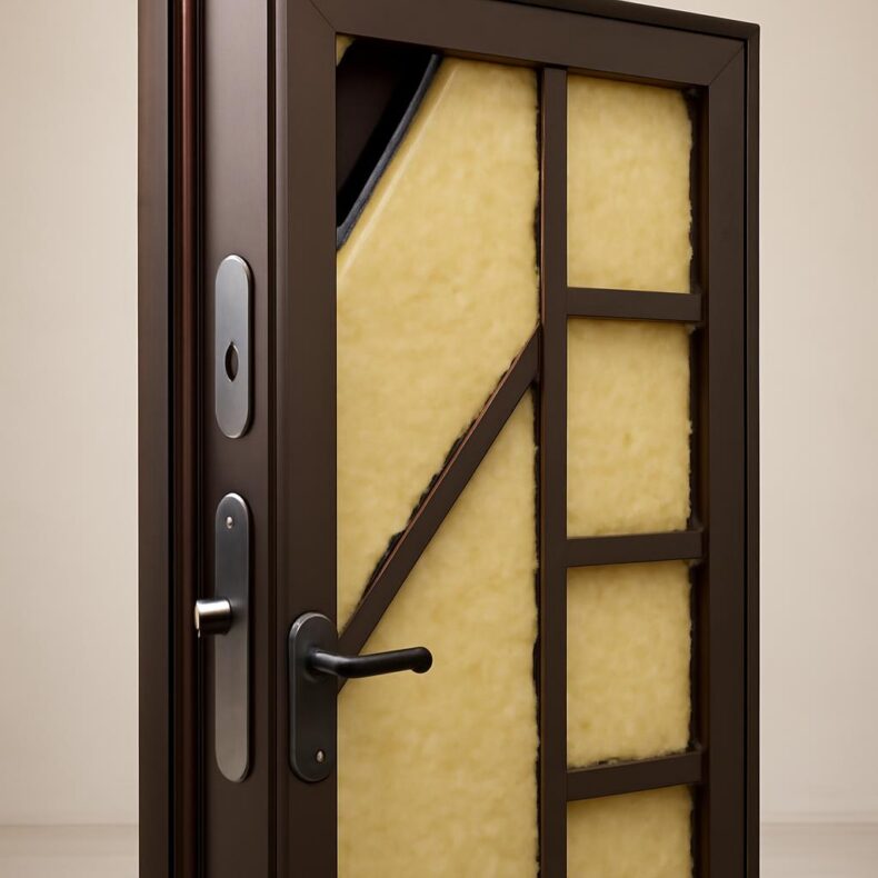 Окей, со скелетом разобрались. А что между рёбрами? Пустота? Ни в коем случае! Там должен быть наполнитель. Он отвечает сразу за две супер-важные вещи: теплоизоляцию и шумоизоляцию. Если вы не хотите зимой чувствовать сквозняк от двери или слышать, как соседка по лестничной клетке обсуждает по телефону последний сериал на наполнитель смотрим ооочень внимательно.